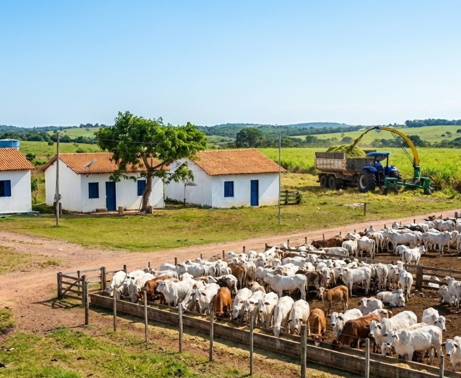 Agricultura para Silagem: As imagens mostram operação de colheita de milho/sorgo com maquinário pesado e vagões forrageiros, comprovando a aptidão agrícola para suporte ao confinamento.