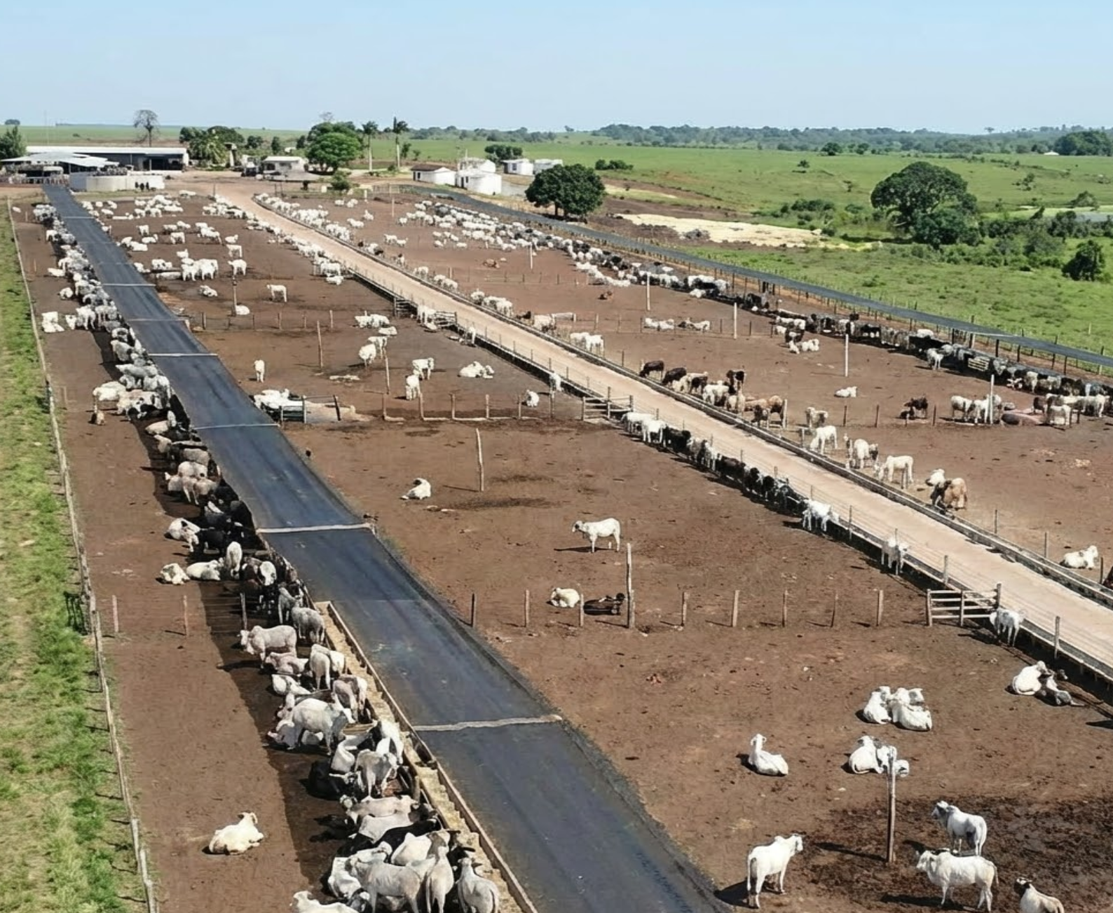 Confinamento: Estrutura ativa para 2.000 animais (com projeto de expansão para 6.000). As fotos revelam cochos de concreto, corredores de trato pavimentados e gado de alta genética.