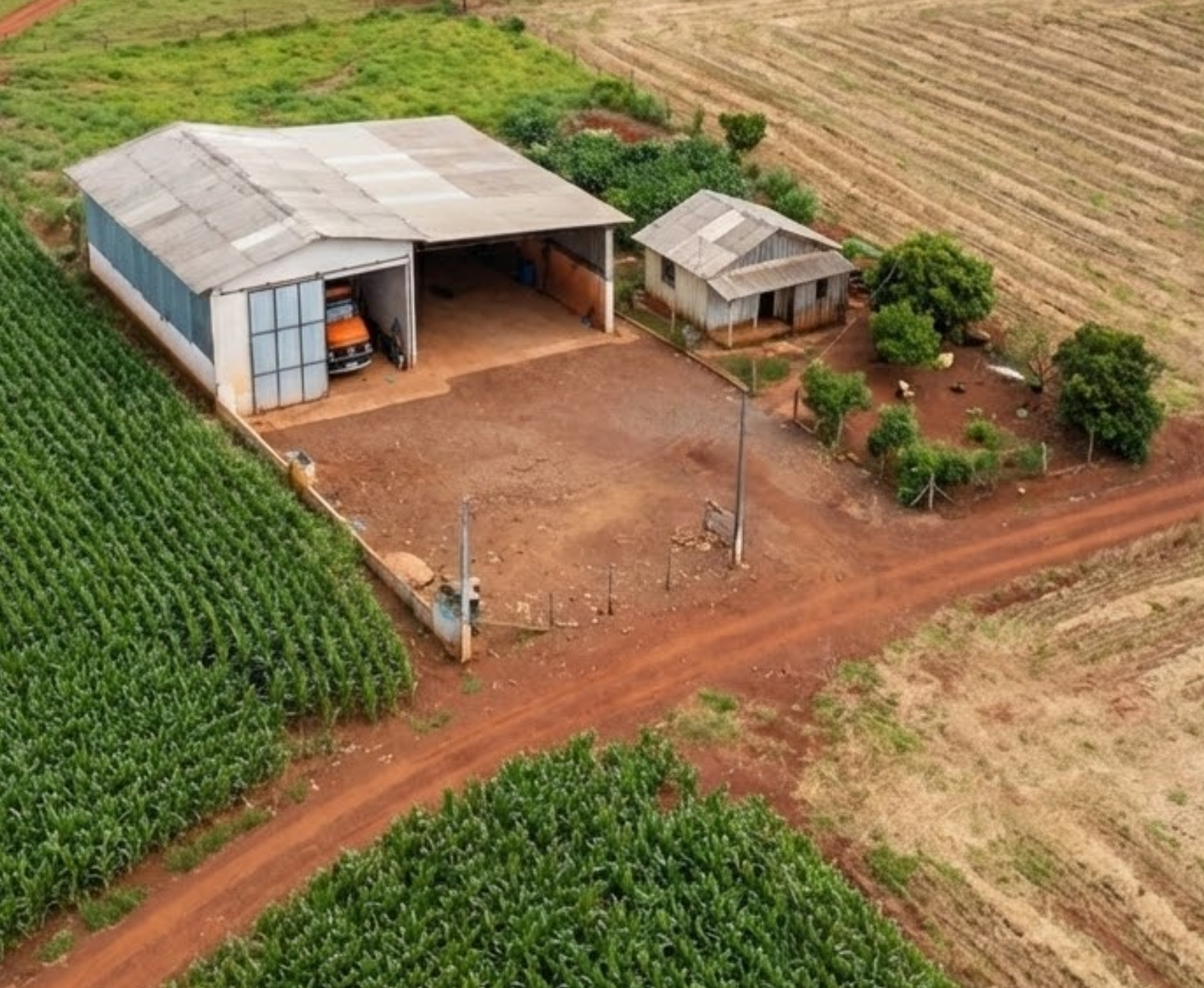 Armazenamento e Oficina: Conta com 03 Barracões (02 fechados e 01 aberto), funcionando como oficina e garagem para maquinário e caminhões.