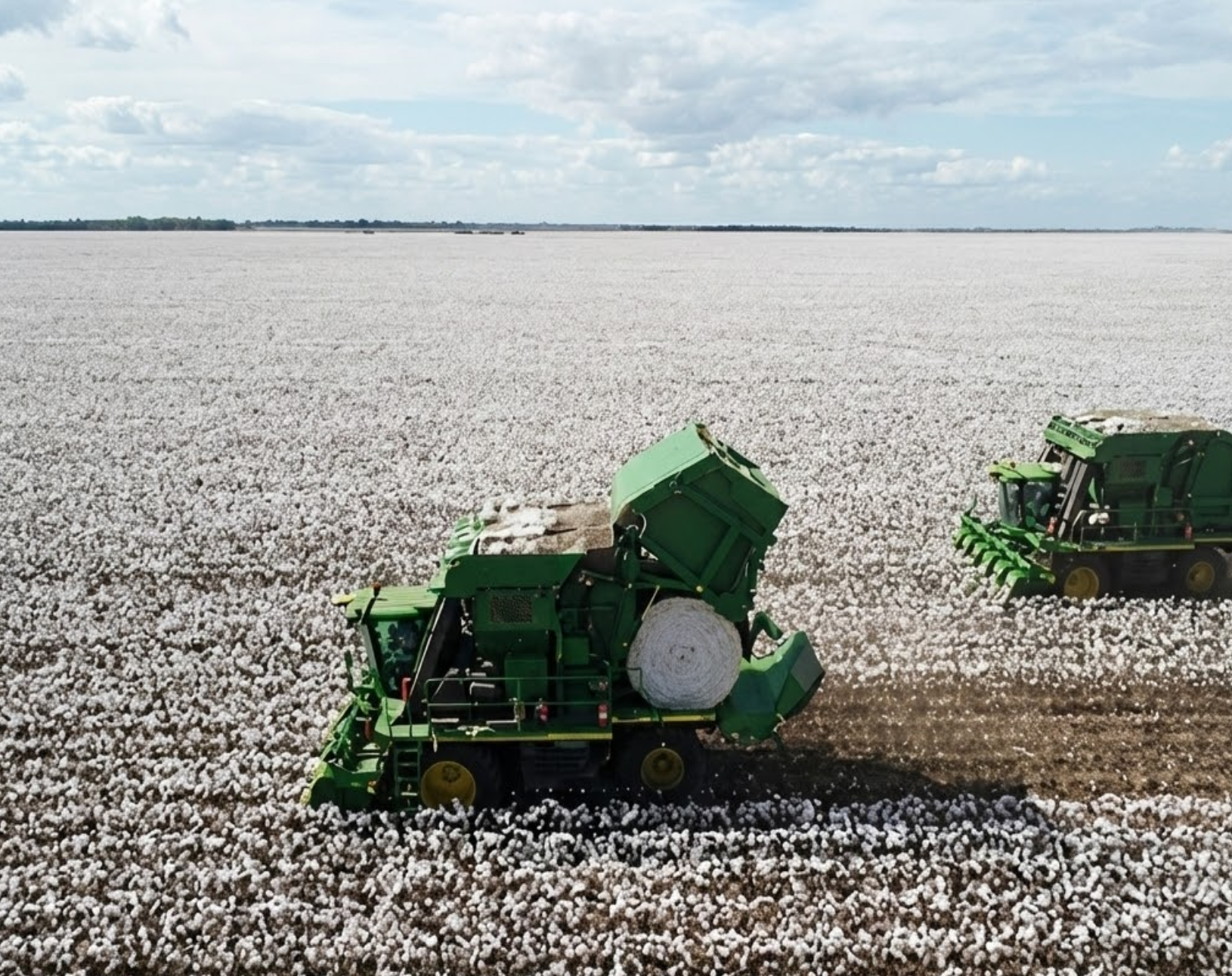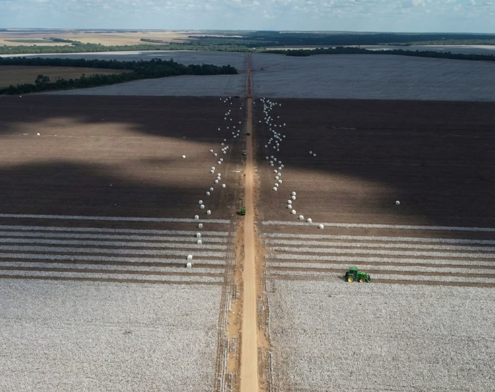 Algodão: As imagens confirmam a aptidão para cotonicultura de alta tecnologia, com lavouras extensas e maquinário específico (colheitadeiras de fardo redondo John Deere), indicando o mais alto nível de fertilidade e investimento tecnológico.