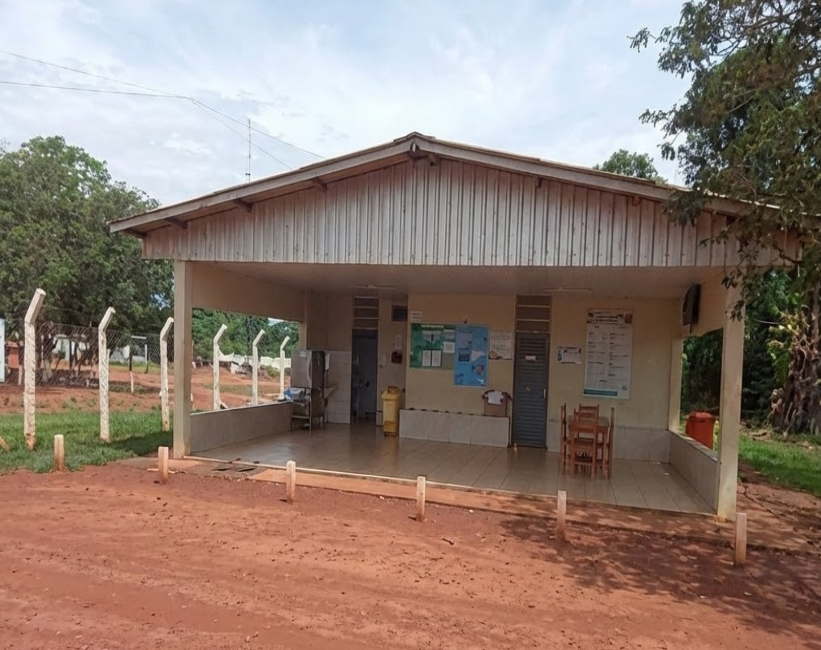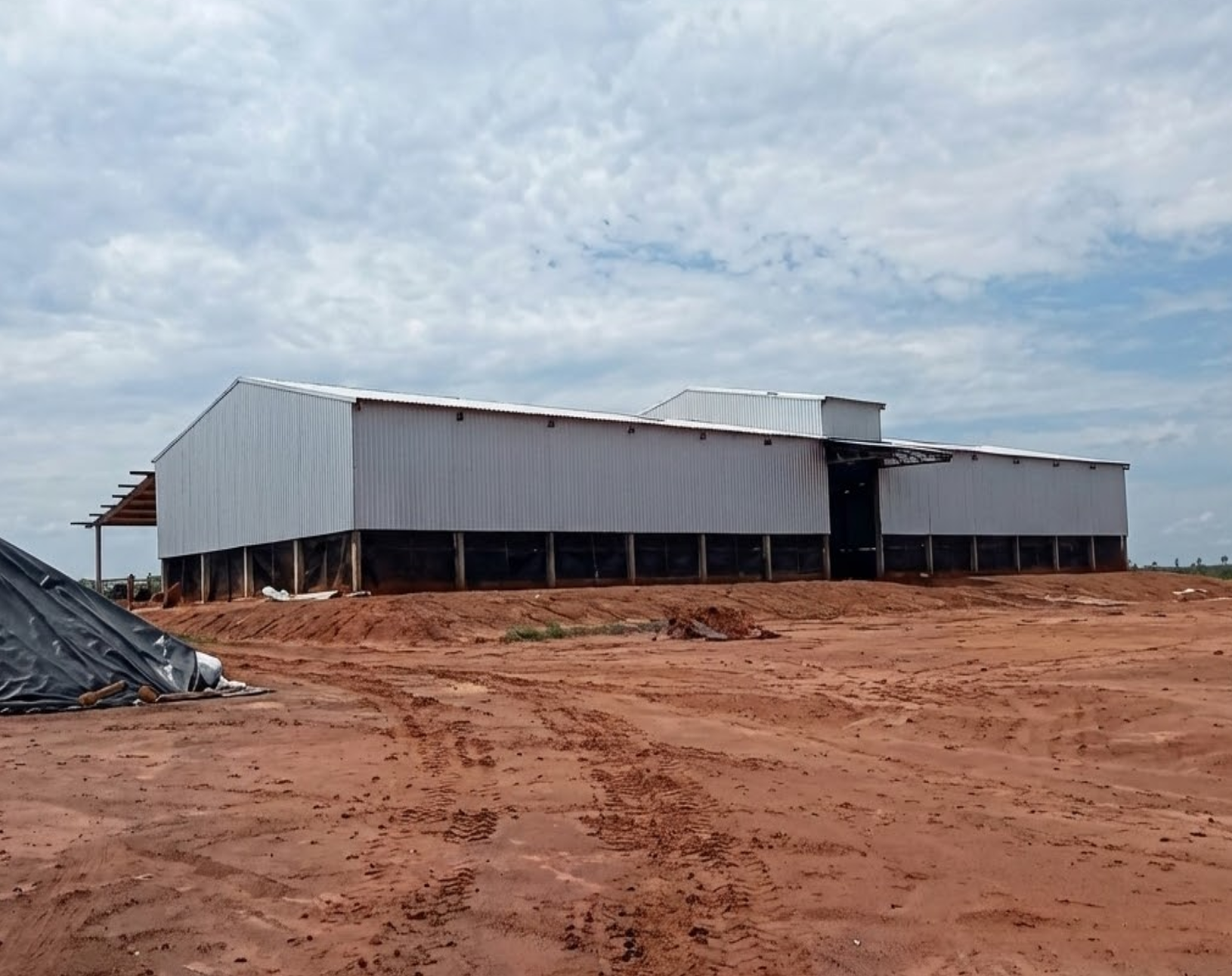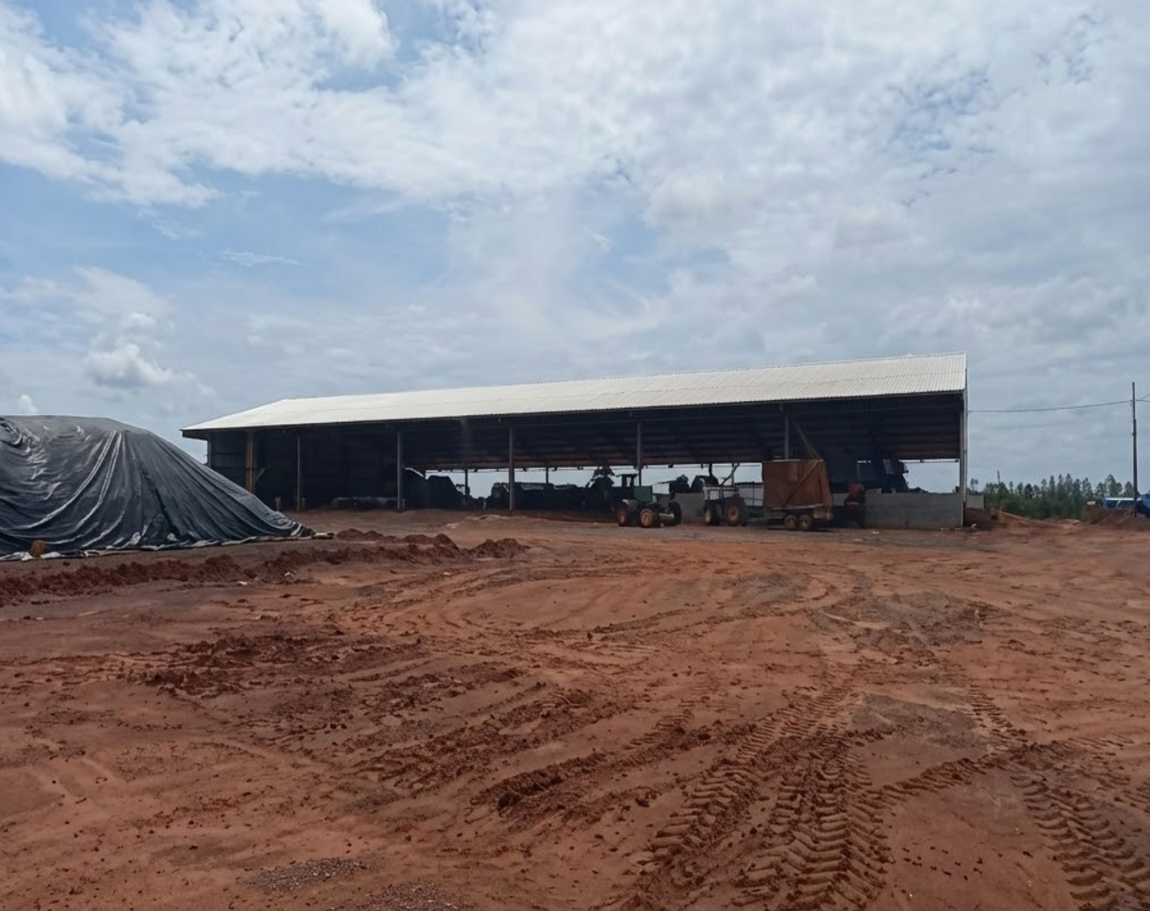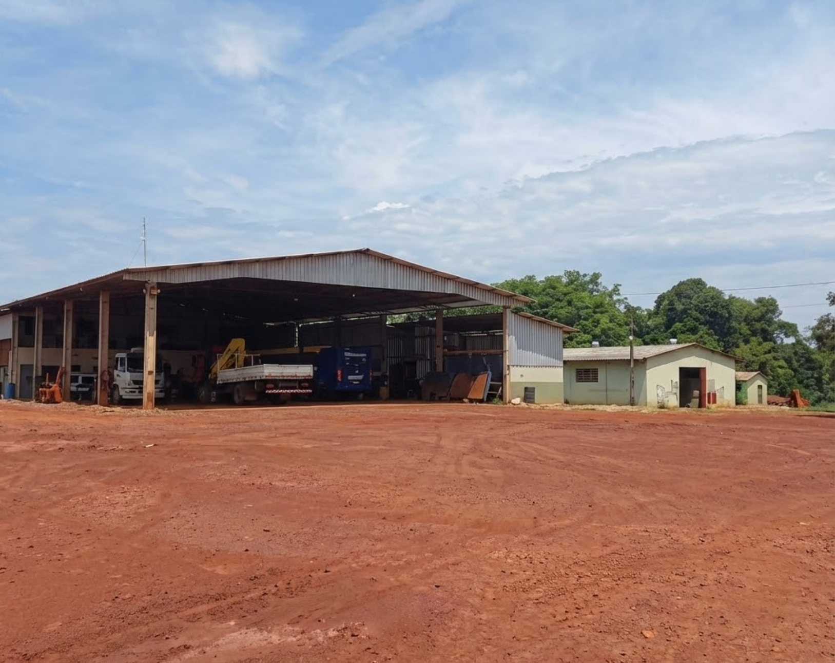 Barracão de Máquinas: Galpão com pé-direito alto e piso compactado/cimentado.
