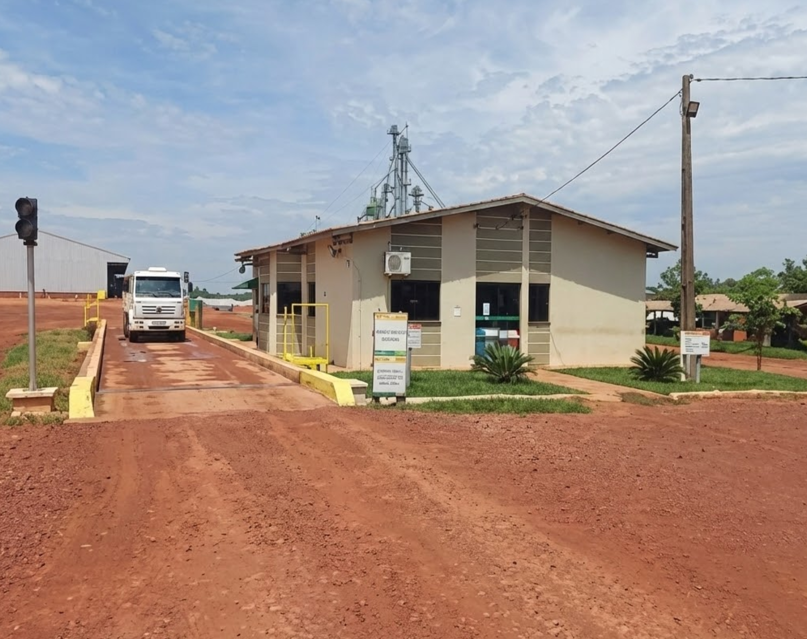 Sede Administrativa: Estrutura de escritório ("Office Structure") moderna, em alvenaria, com acesso pavimentado e balança rodoviária integrada.