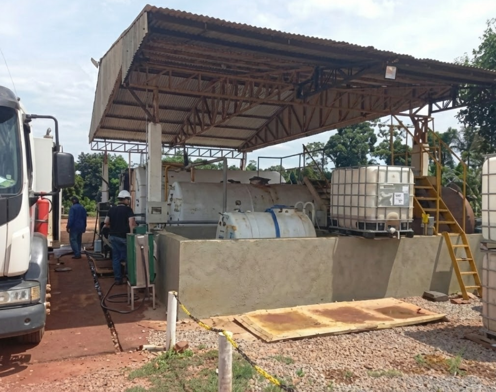 Abastecimento: Posto de combustível ("Fuel Station") coberto, com contenção e tanques aéreos.