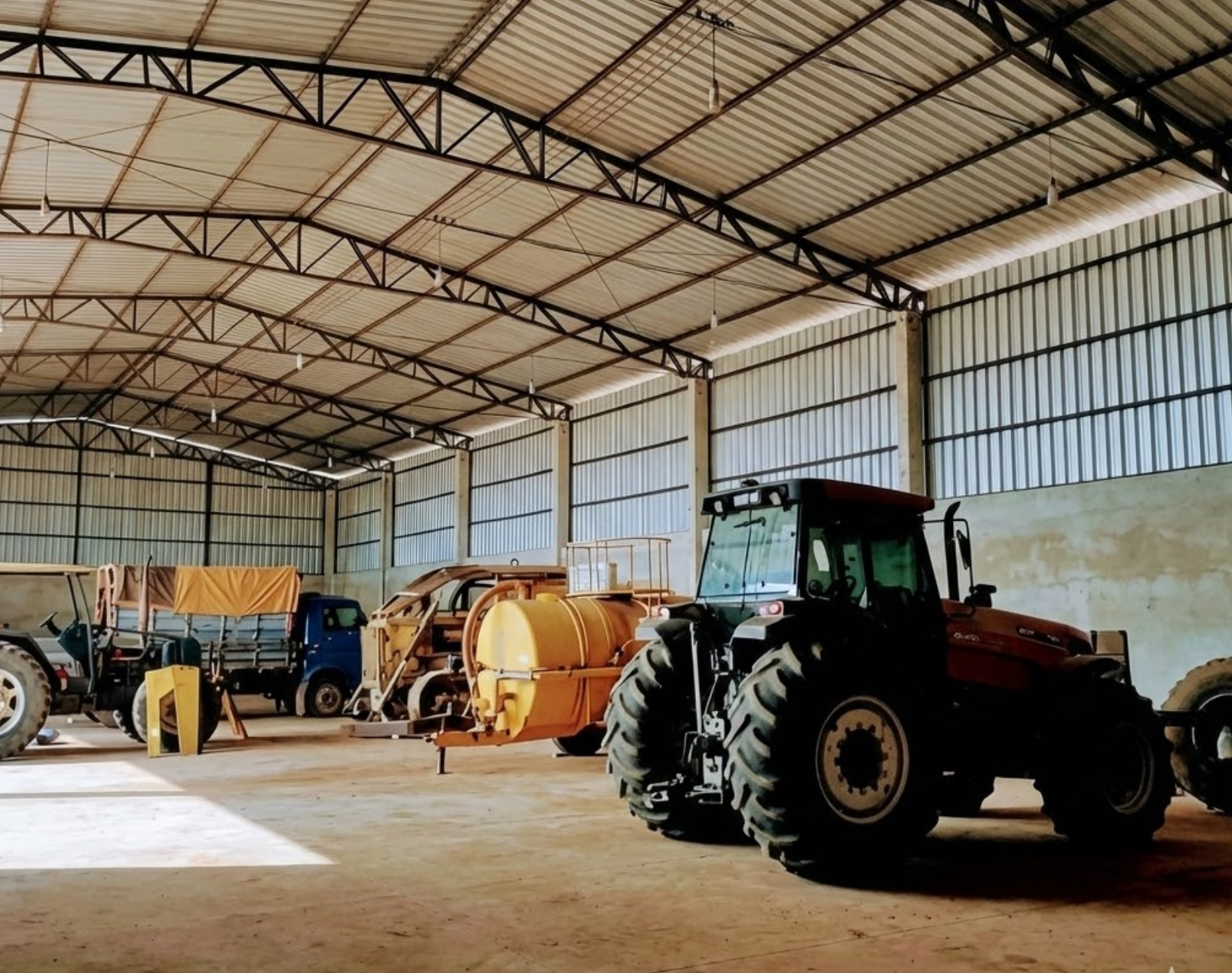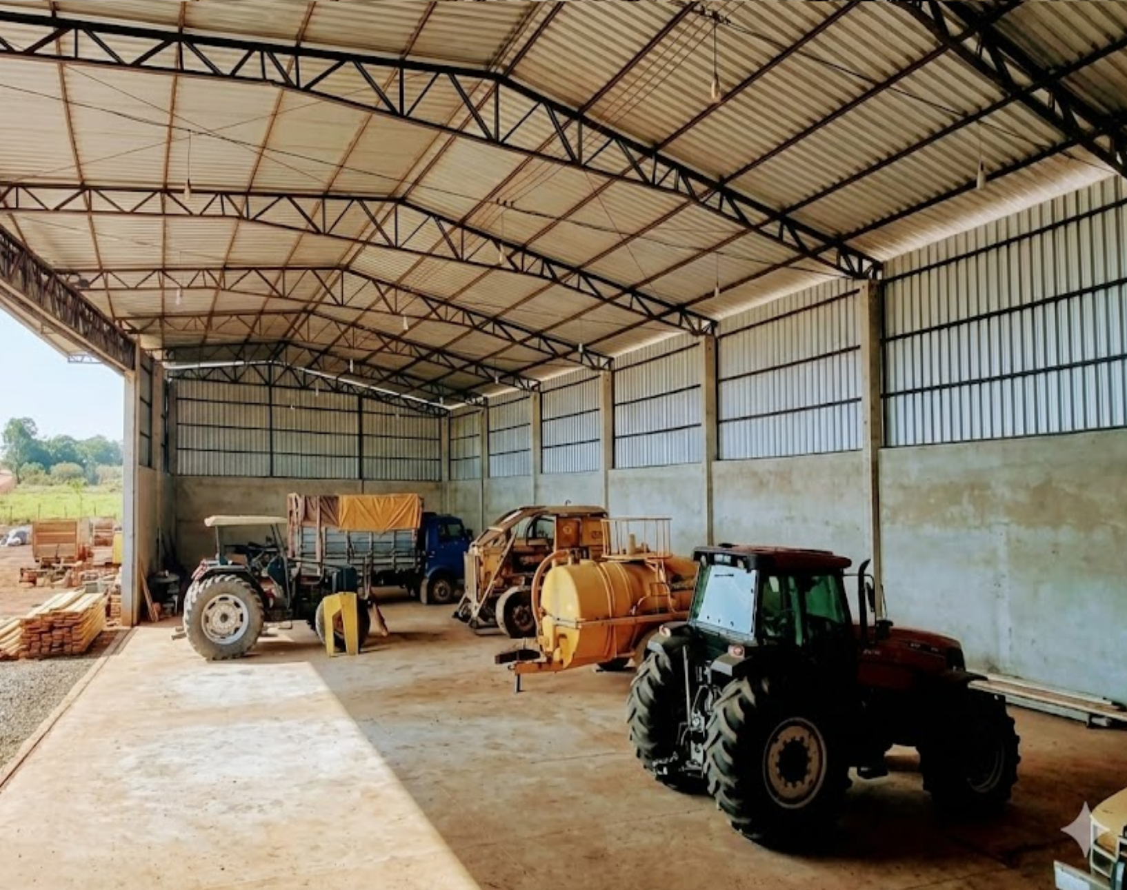 Galpão de Máquinas (Destaque): As imagens revelam um barracão amplo com estrutura metálica (pé-direito alto), piso cimentado e laterais em alvenaria parcial. O espaço abriga tratores, caminhões e tanques de combustível, protegendo o ativo imobilizado.